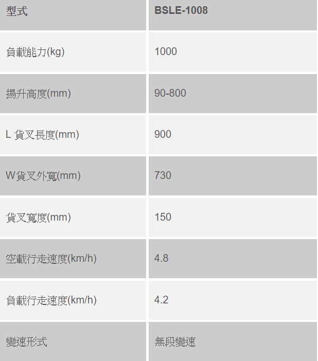 .昇降電動方式,省時省力,動力推行,輕巧靈活。 .車體精巧,迴轉半徑小,適合巷道及狹窄空間。 .荷重1000kgs,揚高2500mm。 .前叉輪配備雙輪組設計,分散載重量。(選配) .緊急斷電開關,確保作業安全。 .主要配備西德原裝高級零組件,穩定度更高。 .配備歐洲名牌原裝大型工業電瓶,可作長時間連續作業。